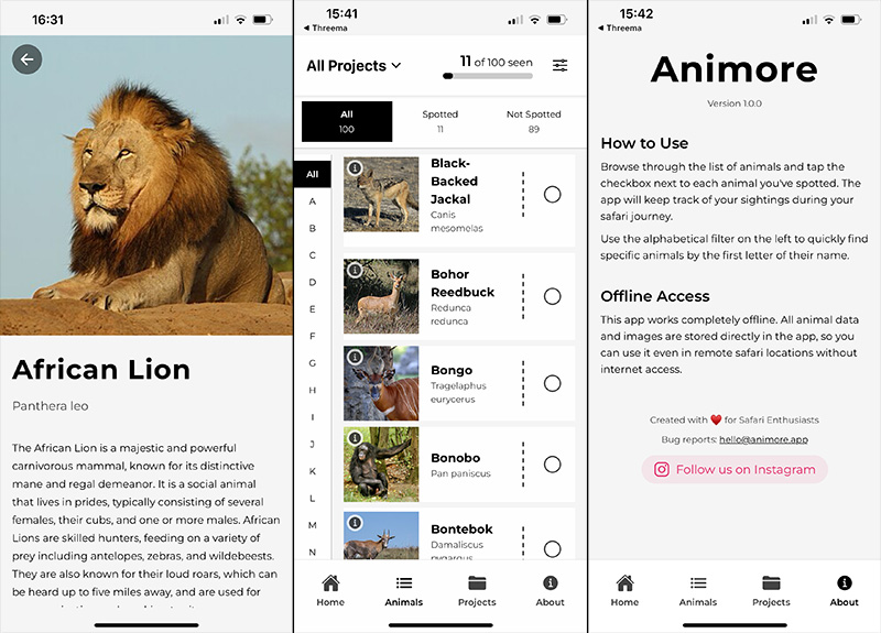 ANIMORE is the favorite animal sight tracking app on the app-stores. Check out what features you can use, needless to say online & offline! Because you don’t want to look for wifi while your favorite big cat is next to your car…
